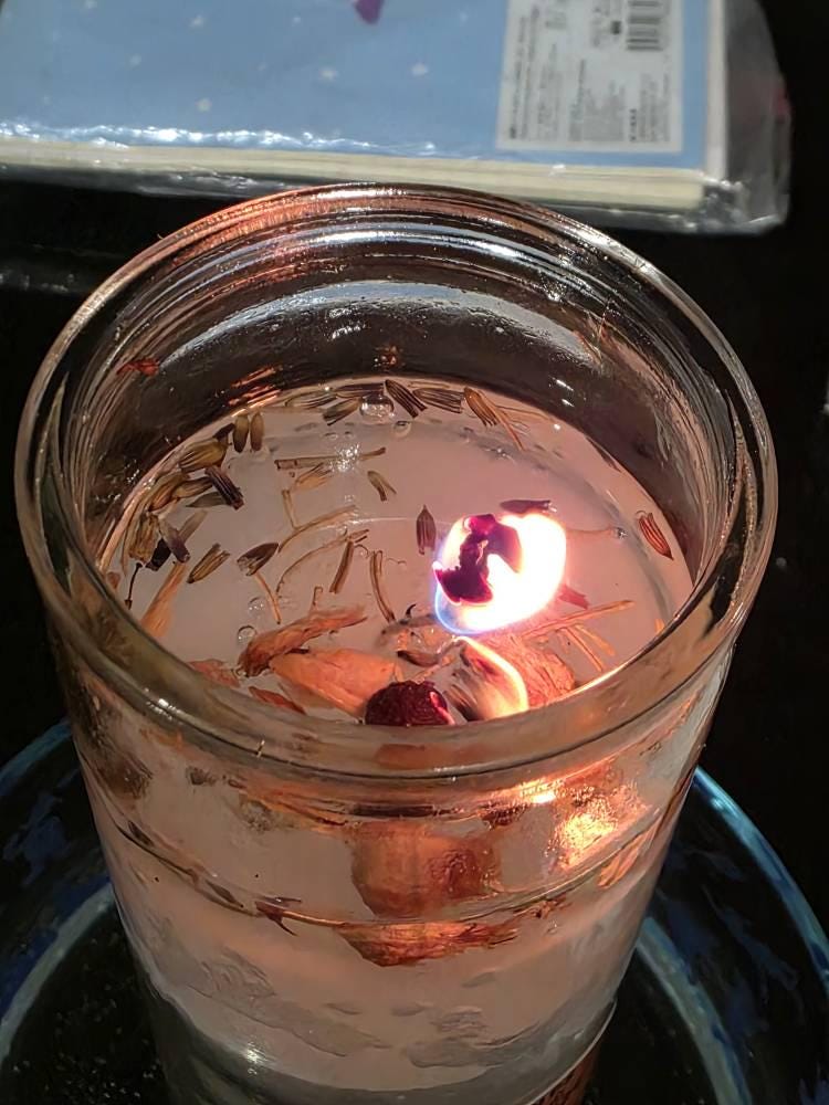 BEFORE LIGHTING YOUR CANDLE, MAKE SURE THE OFFERINGS (HERBS ON TOP OF THE CANDLE) ARE NOT TOO CLOSE TO THE WICK, THIS COULD RESULT IN A FIRE HAZARD SITUATION. (I NEVER OVERDO THE HERBS FOR THE SAME REASON) SO MOVE THE OFFERINGS AS FAR AS YOU CAN FROM THE WICK.