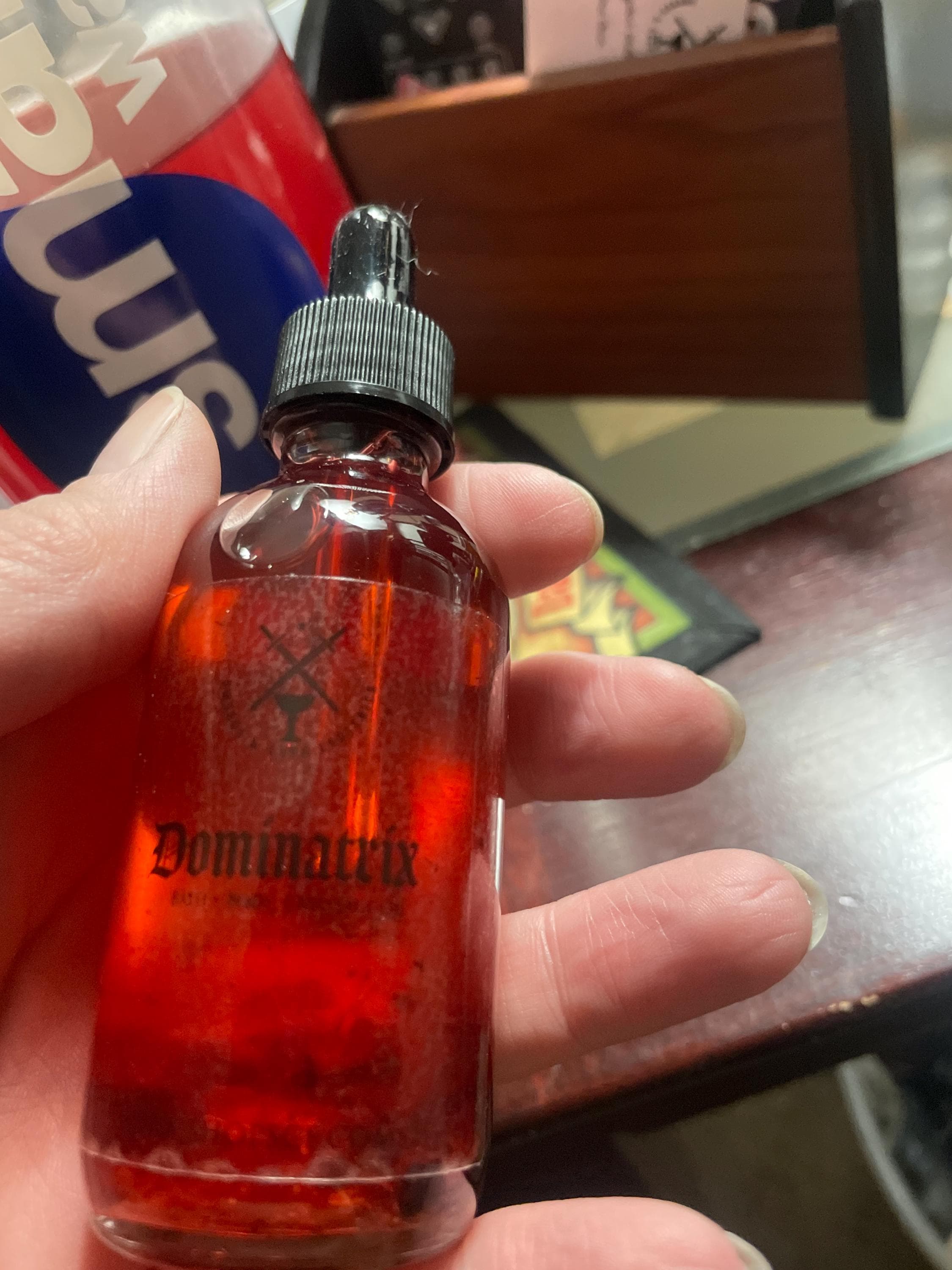 Dominatrix is a very sensual, attractive, and sweet body oil. It contains aphrodisiac ingredients and herbs, such as patchouli, ylang ylang and jasmine. Its also infused with garnet stones that enhance vitality, confidence, sexual energy, attraction, and root chakra balance.